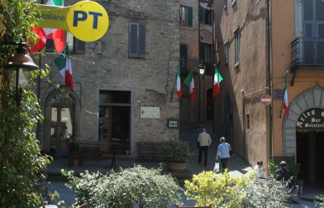 High up on a ridge, watching over the valley of the river Carpina, facing the Appenin peaks far in the back; a fully preserved surrounding wall, on top of it the small houses with colourful fronts, nestled around the piazza, center of the village and Italian life in small scale. Not over-crowded… but in contrast to many other villages still a lively place, and not merely a “museum”.