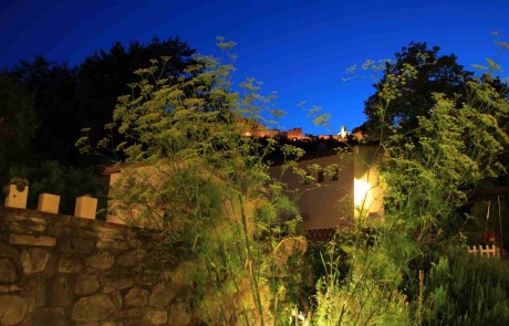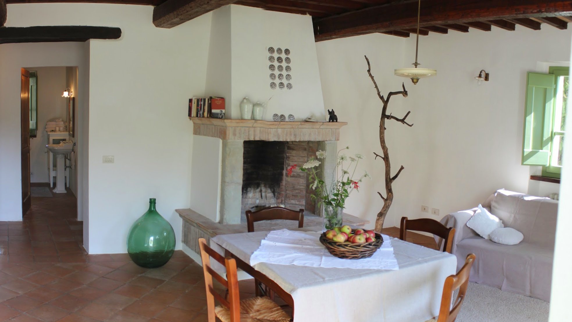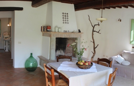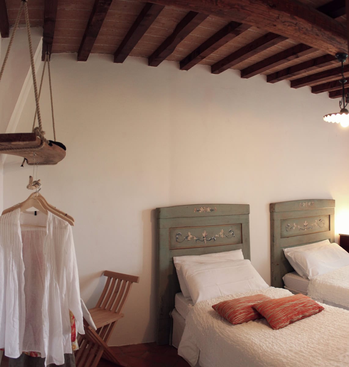 La nostra suite più grande a destra al primo piano dell’edificio principale L’ARIETE con vista sul cortile in fiore e le verdi colline dell’Umbria.