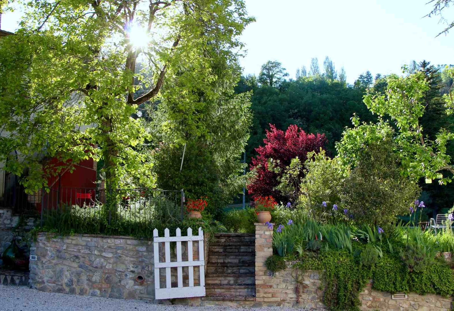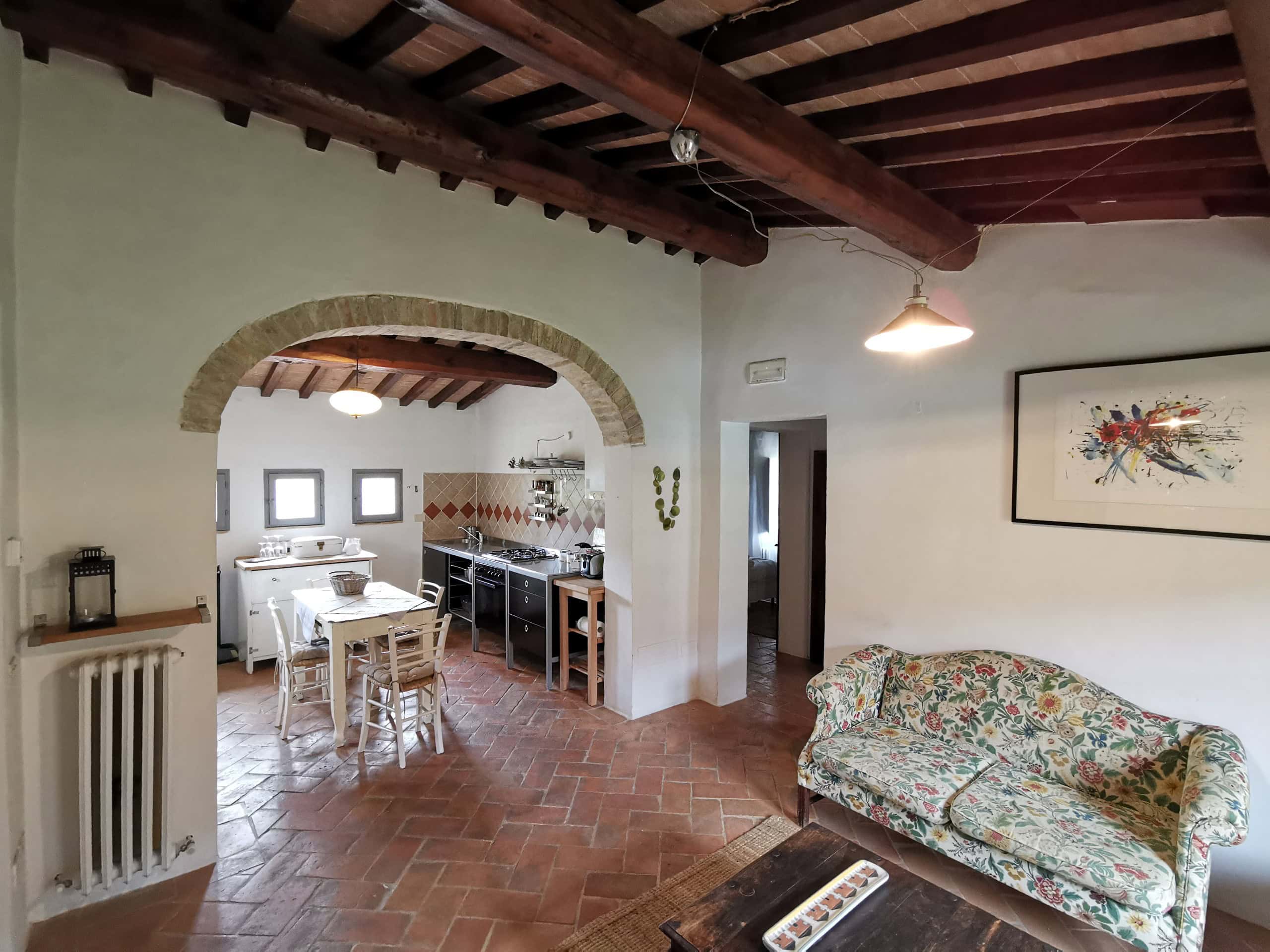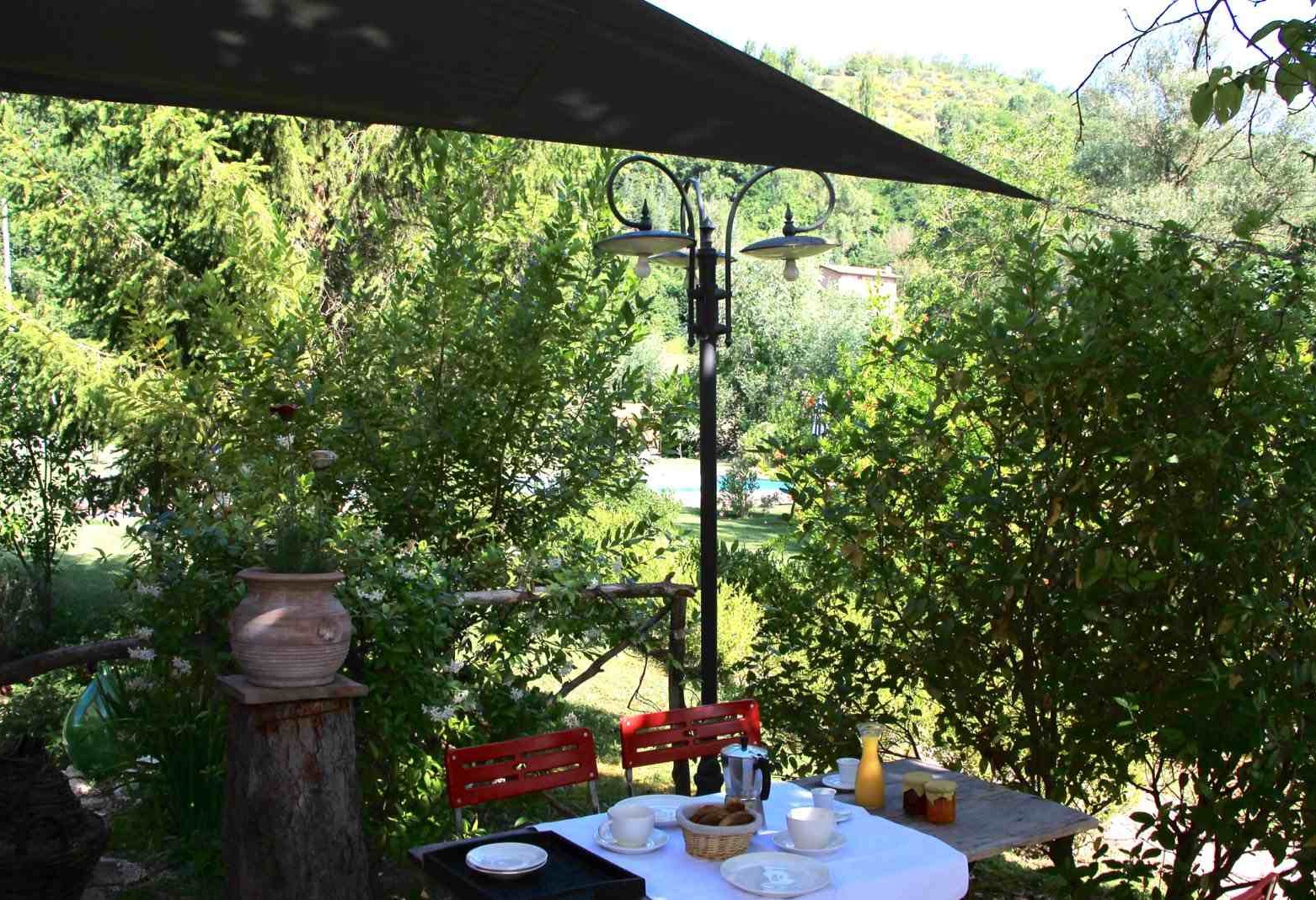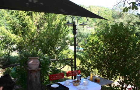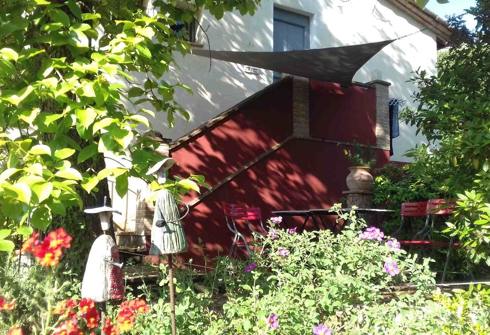 Capriolo ist eine weitere große Ferienwohnung – 70m² im ersten Stock einer umgebauten Scheune, mit Blick über den Innenhof, Richtung Richtung Pool und hinauf nach Montone. Besonders schön ist die Terrasse unter dem alten Khaki – Baum, der auch im Sommer einen tollen Schatten gibt.