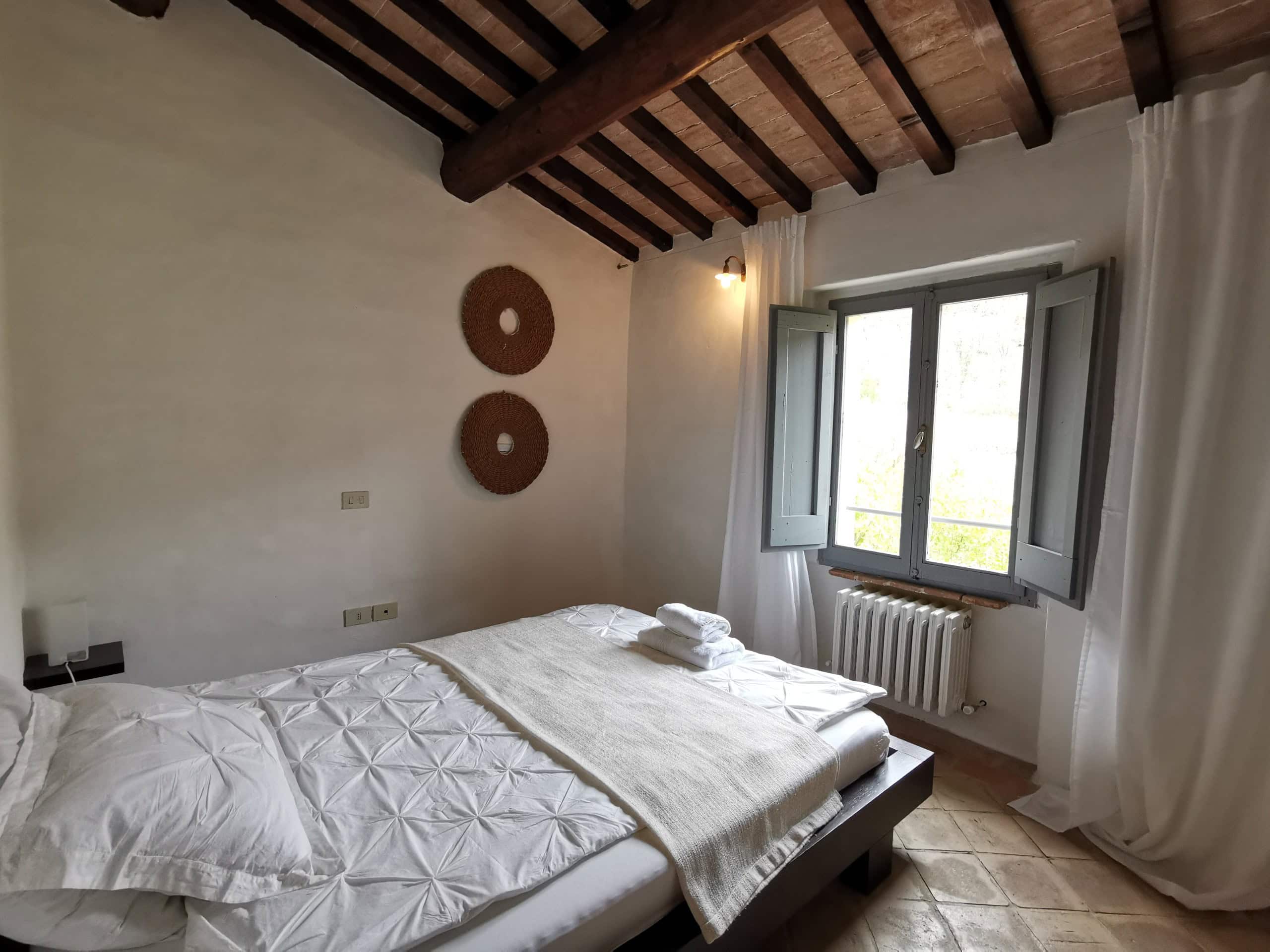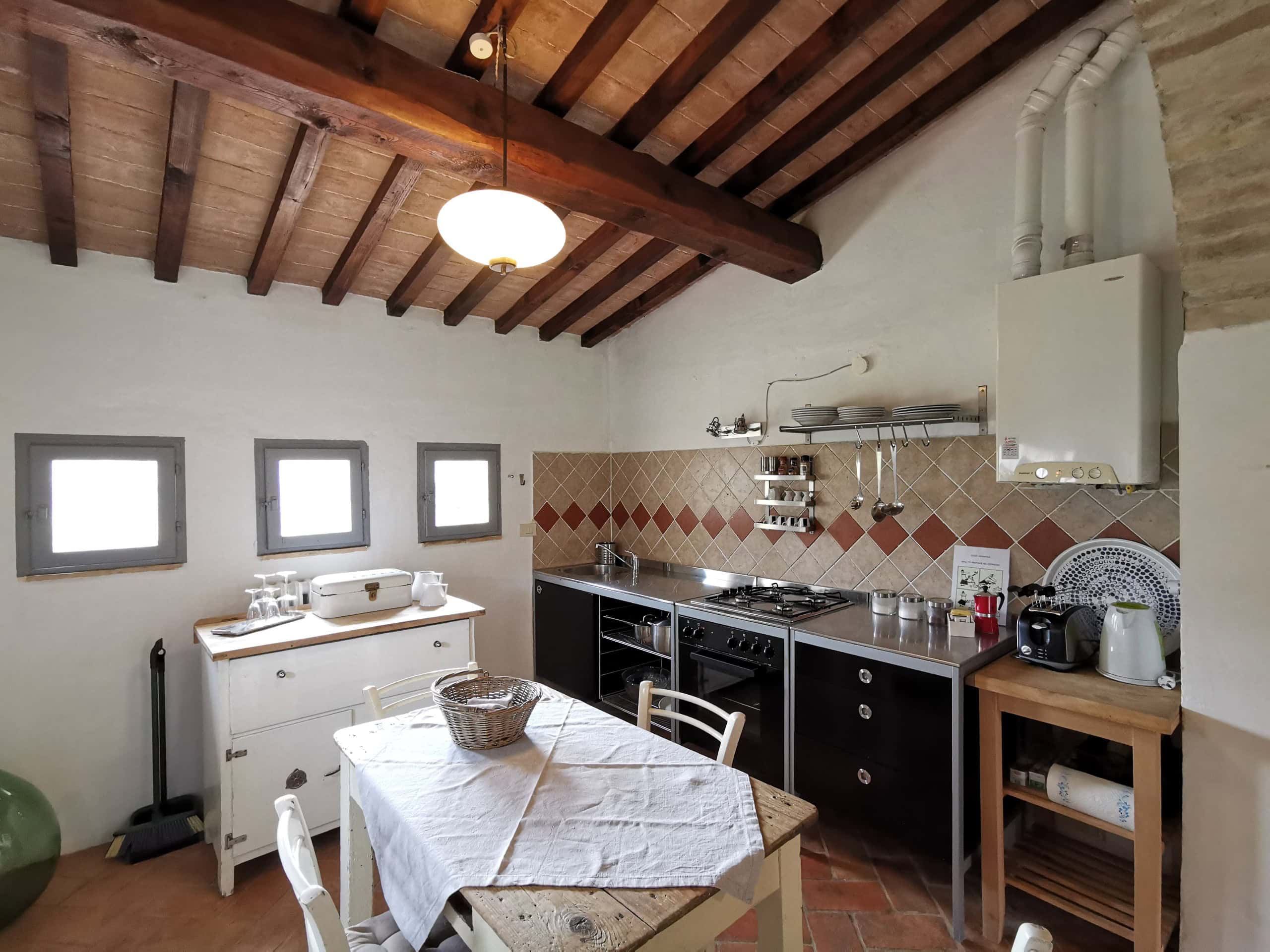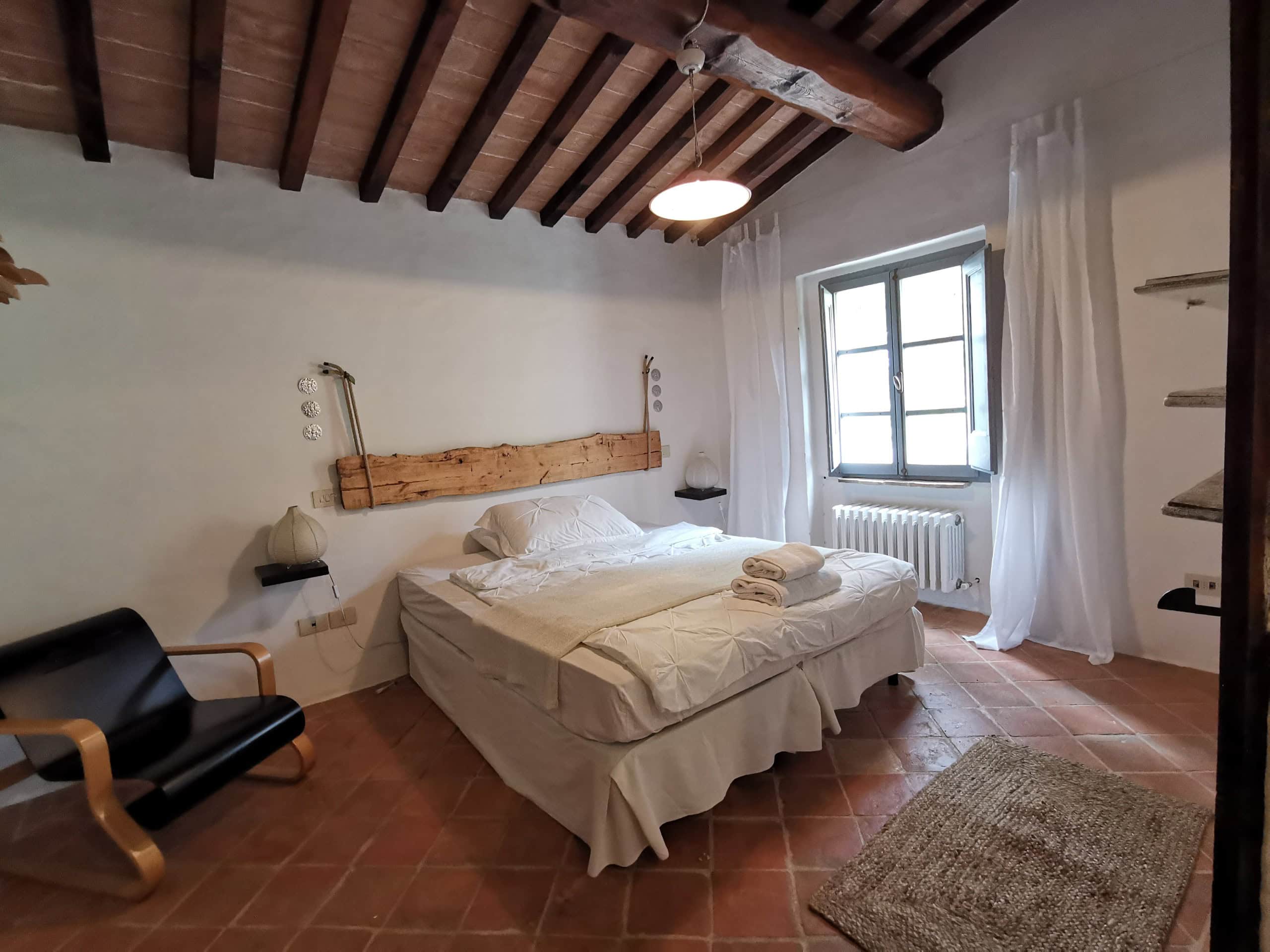 Capriolo ist eine weitere große Ferienwohnung – 70m² im ersten Stock einer umgebauten Scheune, mit Blick über den Innenhof, Richtung Richtung Pool und hinauf nach Montone. Besonders schön ist die Terrasse unter dem alten Khaki – Baum, der auch im Sommer einen tollen Schatten gibt.