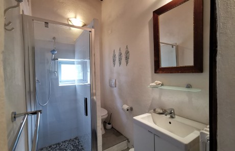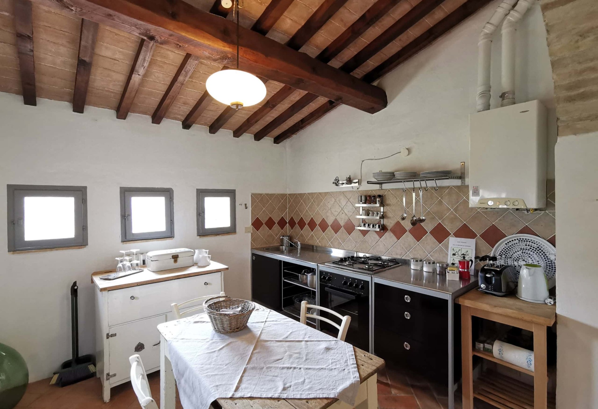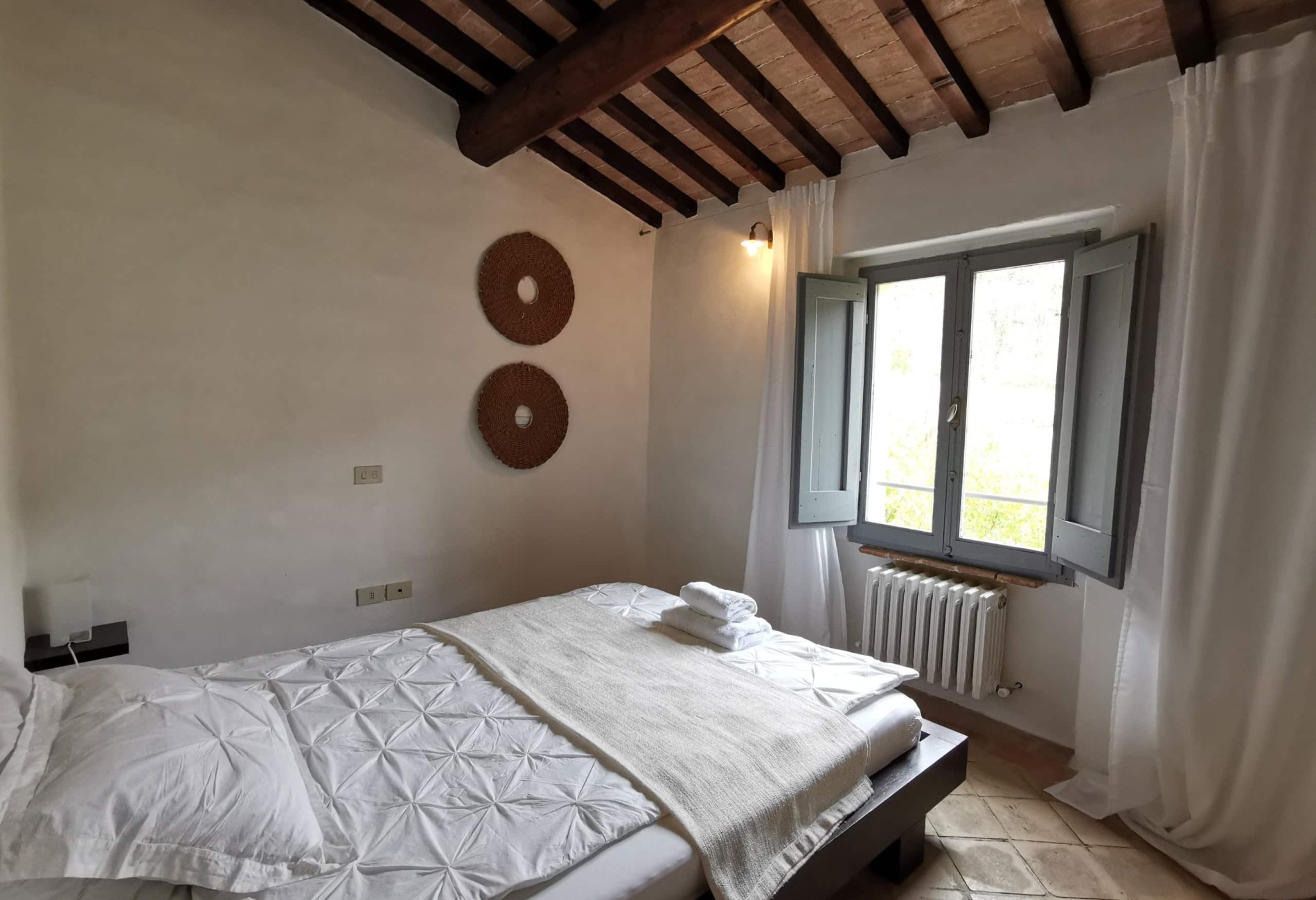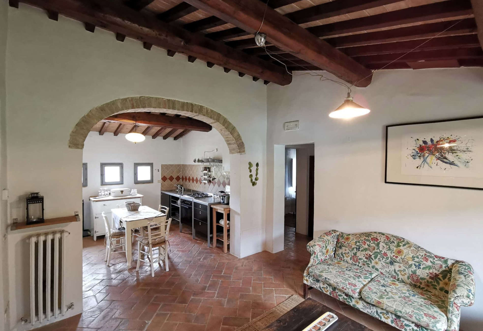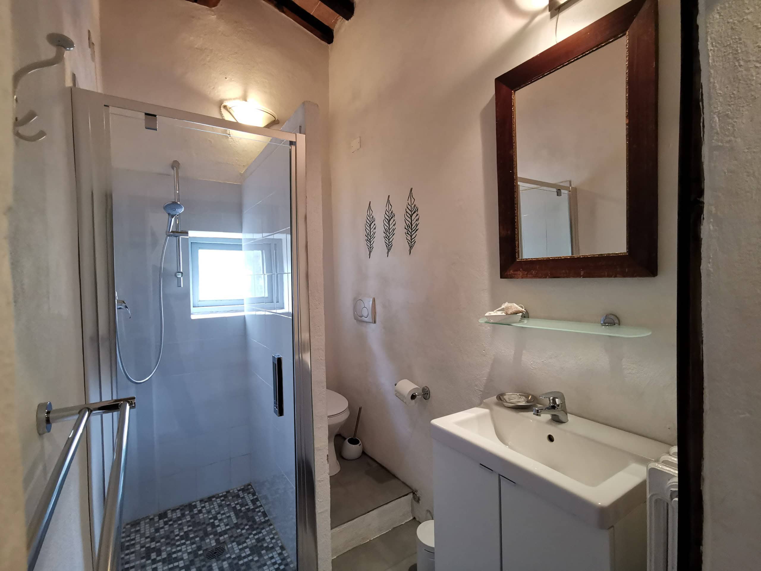 Capriolo ist eine weitere große Ferienwohnung – 70m² im ersten Stock einer umgebauten Scheune, mit Blick über den Innenhof, Richtung Richtung Pool und hinauf nach Montone. Besonders schön ist die Terrasse unter dem alten Khaki – Baum, der auch im Sommer einen tollen Schatten gibt.