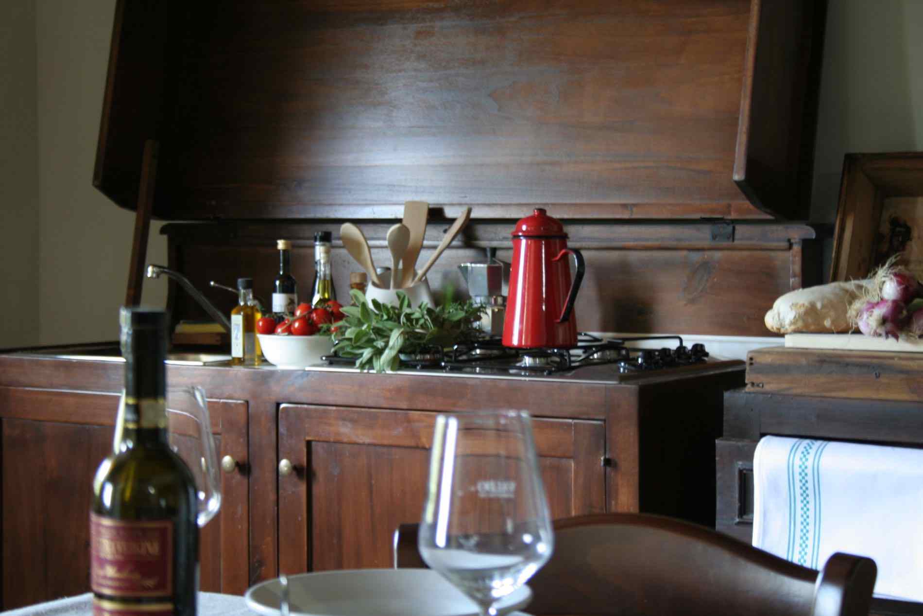 Große, schöne Ferienwohnung mit Blick auf den blühenden Guts – Hof, die große Wiese mit dem Pool, und hinauf zum mittelalterlichen Städtchen Montone.